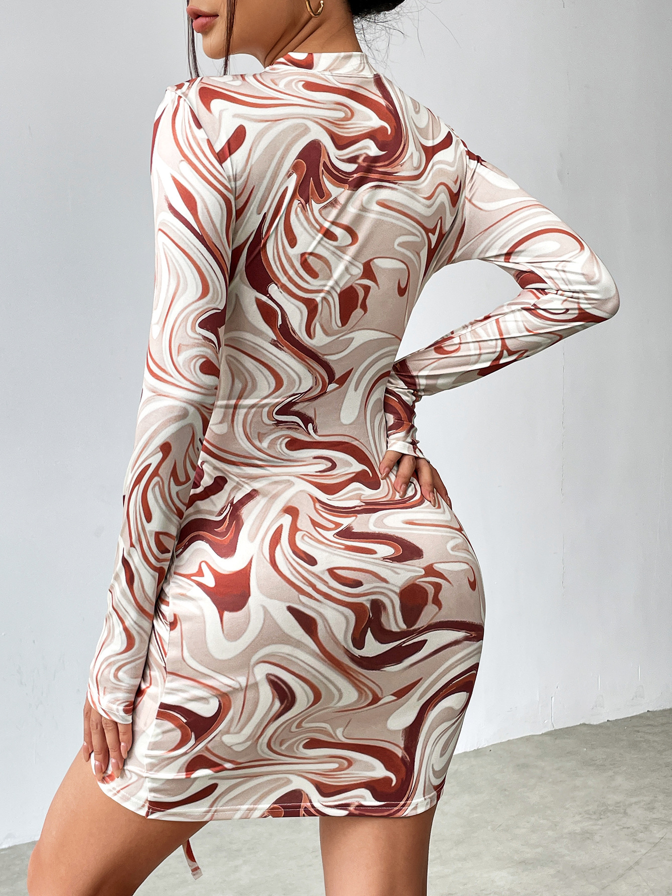 Drawstring Pleated Abstract-print Crew-neck Sexy Long-sleeve Dress